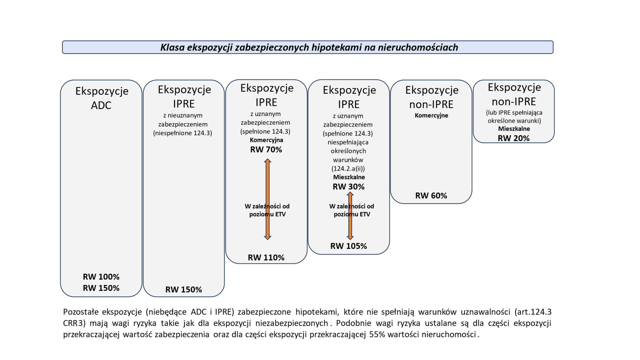 Kolejnym ważnym elementem ustalania wagi ryzyka dla ekspozycji hipotecznej jest właściwa weryfikacja wartości nieruchomości i wyznaczenie wskaźnika ETV, będącego stosunkiem ekspozycji do wartości tej nieruchomości. Tak jak dotychczas, warunkiem uznawalności takiej wyceny jest obowiązek dokonania jej przez rzeczoznawcę posiadającego niezbędne kwalifikacje w zakresie dokonywania wycen, a proces ten musi być niezależny od procesu podejmowania decyzji kredytowych przez instytucję. Nowym elementem wyceny uwzględnianej w kalkulacji wymogu kapitałowego jest konieczność odniesienia tej wyceny do średniej wartości tej nieruchomości lub nieruchomości porównywalnej w ciągu ostatnich sześciu lat w przypadku nieruchomości mieszkalnej lub ośmiu lat dla nieruchomości komercyjnych.